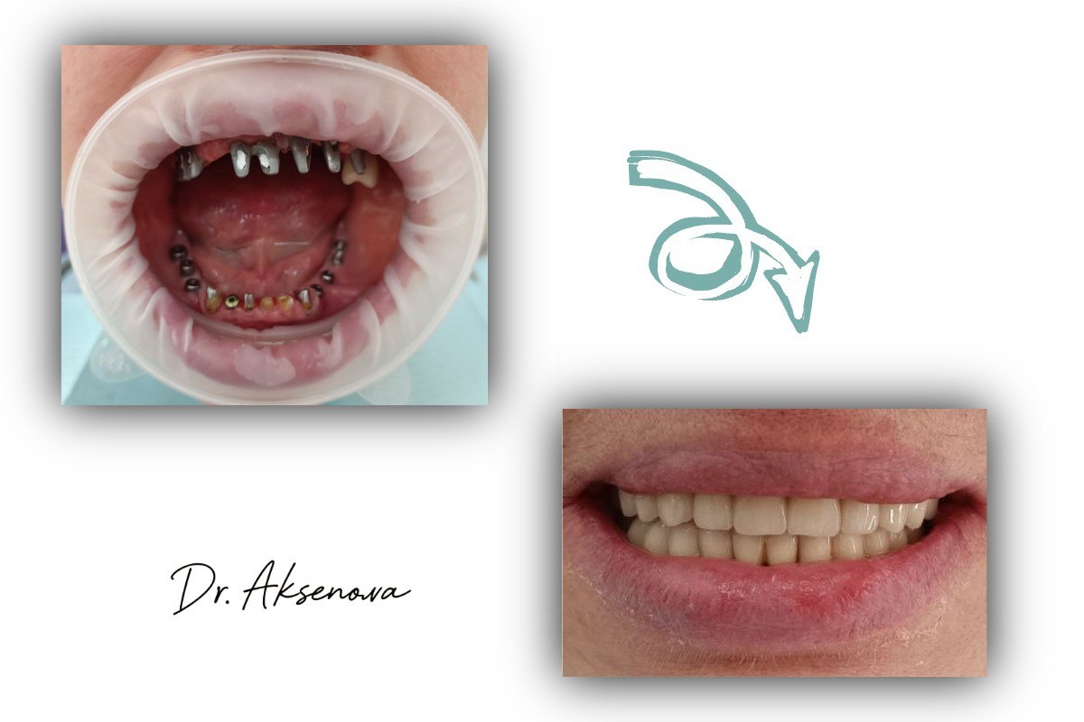 : 1️⃣ Большая костная пластика - создали фундамент там, где своего объема уже не хватало. 2️⃣ Установка имплантов - опоры для будущих зубов. 3️⃣ Протезирование - финальный этап. Но был нюанс: между операциями нужно было зафиксировать правильное положение нижней челюсти и подобрать идеальную высоту прикуса. Без этого вся конструкция могла «поехать». Решение: На время, пока импланты приживались и кость адаптировалась, мы сделали частичную временную конструкцию на имплантах. Зачем? ✅ Чтобы нижняя челюсть стояла в нужном положении - ни миллиметра в сторону. ✅ Чтобы подобрать идеальную высоту прикуса - комфортную, физиологичную, правильную. ✅ Чтобы пациентка всё это время выглядела хорошо. Никаких «дырок», никакого стеснения. Улыбаться можно было уже в процессе. Итог: Когда пришло время финального протезирования, у нас уже были: ➖ точные параметры прикуса, ➖ адаптированные ткани, ➖ привыкшая к конструкции пациентка. Осталось только перенести всё это в постоянные зубы. Что мы и сделали�