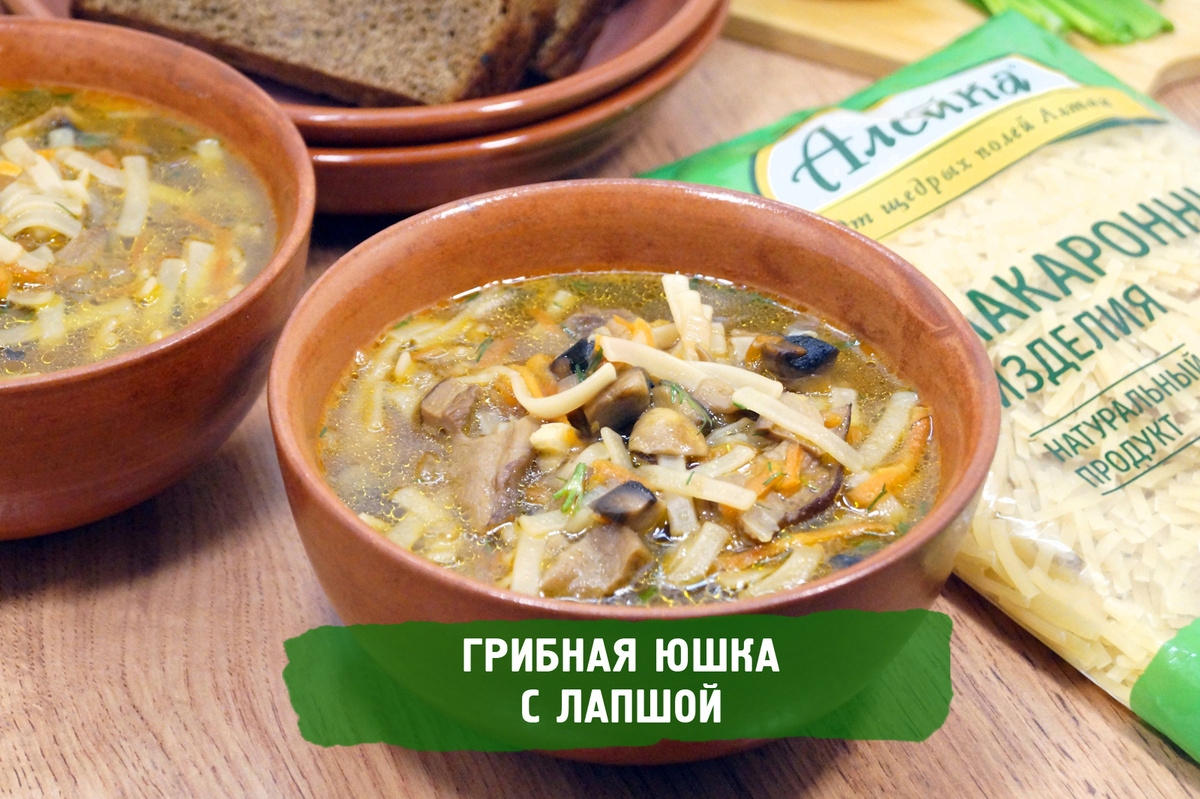 Грибная юшка с лапшой Не нужно быть шеф-поваром, чтобы приготовить этот очень вкусный согревающий грибной суп. Секрет — в сочетании двух видов грибов, которые вместе создают идеальный вкус и аромат. Лапша не разваривается, оставаясь упругой, а натуральное масло подчеркивает сладость моркови и лука. Чесночная нотка и зелень укропа завершают композицию, превращая простой суп в кулинарный шедевр, от которого невозможно оторваться. Время приготовления: 1 час. Ингредиенты: 1, 5-2 литра воды, 150 г свежих шампиньонов, 100 г сушеных белых грибов, 80 г лапши ТМ «Алейка», 1 луковица, 1 морковь, 3 ст. ложки натурального подсолнечного масла ТМ «Алейка», 2 зубчика чеснока, 1 пучок зелени укропа, 1-2 лавровых листа, 1/2 ч. ложки соли. Приготовление: Приятного аппетита!