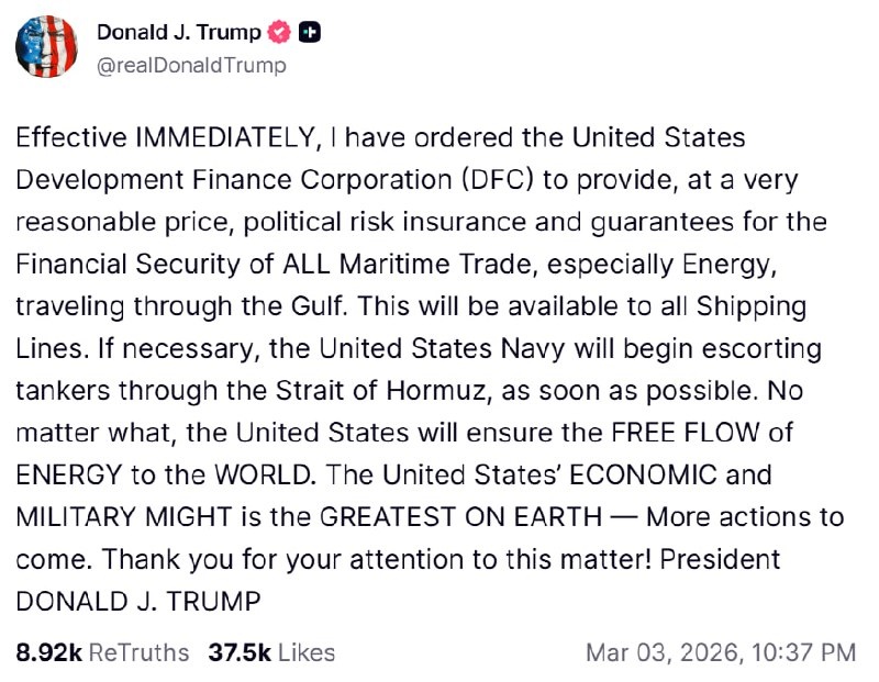 разумной цене страхование политических рисков и гарантии для финансовой безопасности ВСЕЙ морской торговли, в особенности торговли энергоносителями, следующей через залив. Это будет доступно всем судоходным линиям. В случае необходимости Военно-морские силы США начнут сопровождать танкеры через Ормузский пролив в кратчайшие сроки. Несмотря ни на что, Соединенные Штаты обеспечат СВОБОДНЫЙ ПОТОК ЭНЕРГОРЕСУРСОВ ДЛЯ ВСЕГО МИРА. ЭКОНОМИЧЕСКАЯ и ВОЕННАЯ МОЩЬ Соединенных Штатов является ВЕЛИЧАЙШЕЙ НА ЗЕМЛЕ — дальнейшие действия последуют. Благодарю вас за внимание к этому вопросу! 👆Дональд (заботливый) Трамп. 🟪Читай в Max | 🚀Читай в Telegram | 🥰Смотри на RUTUBE