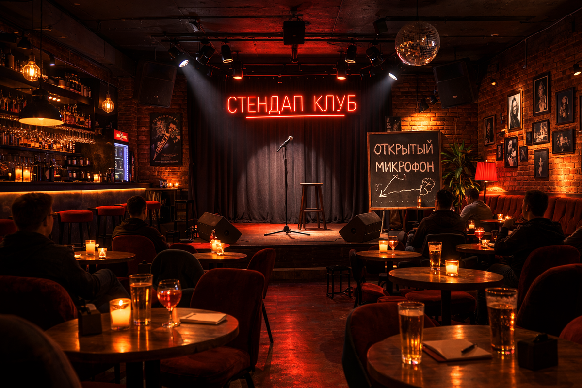 1. Размер и форма зала Идеальный зал - 80–120 посадочных мест. Почему не больше и не меньше? Меньше 50 - ощущение квартирника, где все стесняются и боятся провалиться. Больше 150 - теряется связь между сценой и залом, шутки тонут, а новички чувствуют себя на стадионе. Форма - прямоугольник или лёгкий амфитеатр с небольшим уклоном. Ширина зала должна быть примерно равна глубине. Это даёт ощущение круга, где каждый зритель видит и слышит всех. 2. Сцена - сердце зала Высота сцены - ровно 40–50 см. Комик должен видеть глаза первого ряда, а не макушки. Размер - минимум 3 × 2,5 метра. Достаточно места, чтобы пройтись, но не бегать. Покрытие пола - матовое дерево или тёмный ламинат. Задник - однотонный тёмно-серый или чёрный. Никаких ярких обоев и зеркал - они отвлекают и создают блики. На сцене: - один основной микрофон-стойка - запасной проводной микрофон на столе - маленький мониторный динамик, направленный на сцену, чтобы комик слышал свой голос - бутылка воды 3. Освещение - это 50 % успе