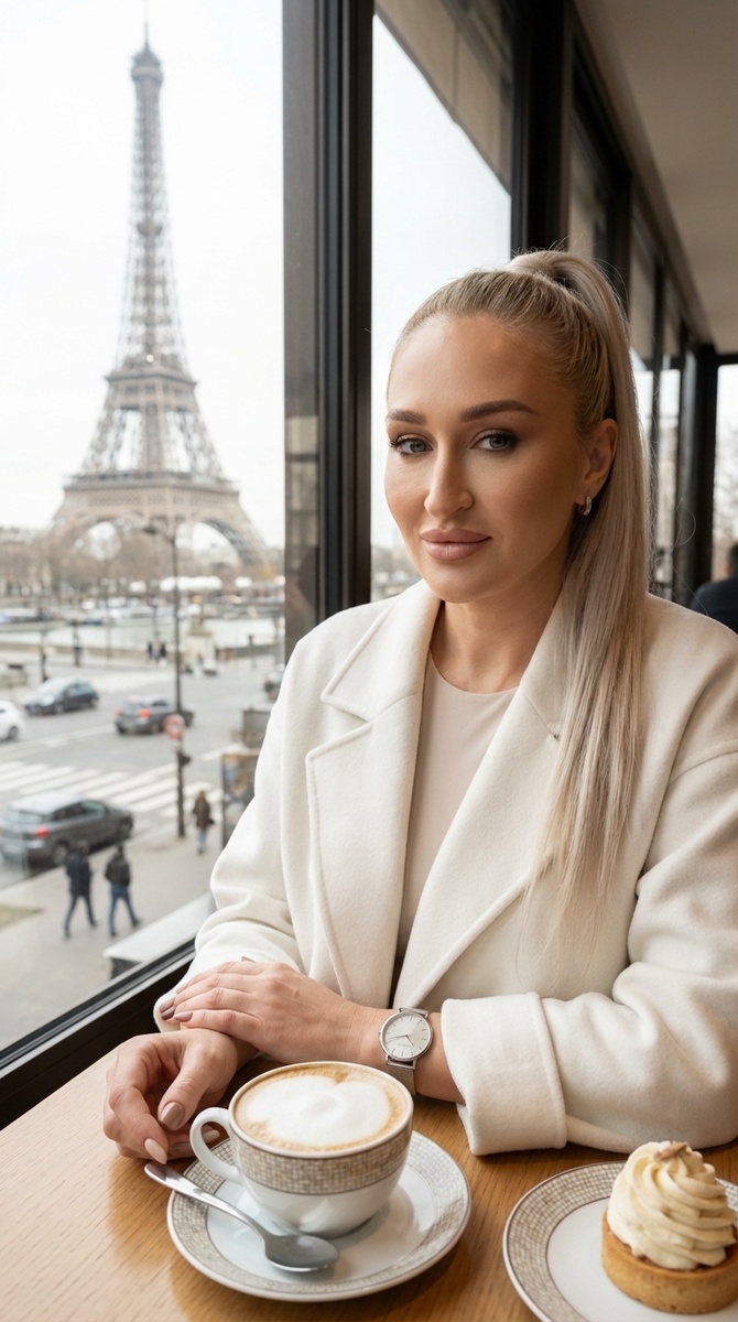 Не меняя внешности женщины с фото. Фотореалистичный портрет молодой женщины, сидящей за столиком в Париже в уютном городском кафе у большого панорамного окна.