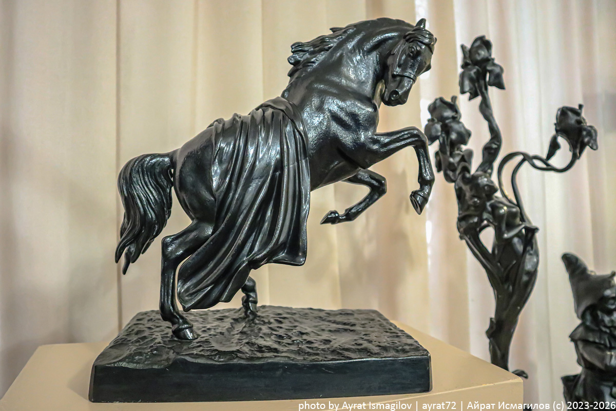 Уральцы настолько суровые, что художественные изделия они изготавливают из чугуна. Однако в городе Касли проживают творческие люди, поэтому каждое изделие из чугуна здесь - шедевр. Мы посещали музей еще в маленьком здании, некогда входившим в состав купеческого имения: Сейчас музей переехал в бывший заводской госпиталь. В 2023 году мы застали капитальный ремонт здания и не знали, что здесь будет. Экспонаты в музее уместились в одном зале. Многие работы узнаваемы. Как, например, чугунная статуэтка "Укрощение коня". Все, кто бывал на Аничковом мосту в Санкт-Петербурге, вспомнят бронзовый оригинал фигуры работы П.К.Клодта 1848 года. Вообще кони в работах каслинских мастеров встречаются часто. "Конь с попоной", что на заглавном фото, присутствует и на гербе города. Вот еще одна работа - "Лошади на воле". Насколько понял, черная краска содержит в составе "голландскую сажу". Одни работы при этом выглядят абсолютно матовыми. Скульптура "Россия", отлитая изначально для Всероссийской выставки в