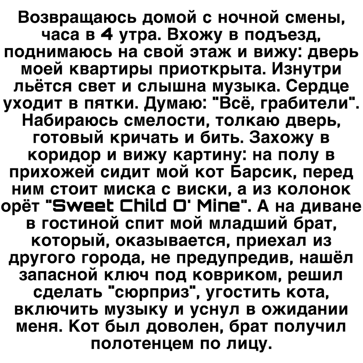 Возвращаюсь домой с ночной смены, часа в 4 утра. Вхожу в подъезд, поднимаюсь на свой этаж и вижу: дверь моей квартиры приоткрыта. Изнутри льётся свет и слышна музыка. Сердце уходит в пятки. Думаю: "Всё, грабители". Набираюсь смелости, толкаю дверь, готовый кричать и бить. Захожу в коридор и вижу картину: на полу в прихожей сидит мой кот Барсик, перед ним стоит миска с виски, а из колонок орёт "Sweet Child O' Mine". А на диване в гостиной спит мой младший брат, который, оказывается, приехал из другого города, не предупредив, нашёл запасной ключ под ковриком, решил сделать "сюрприз", угостить кота, включить музыку и уснул в ожидании меня. Кот был доволен, брат получил полотенцем по лицу.