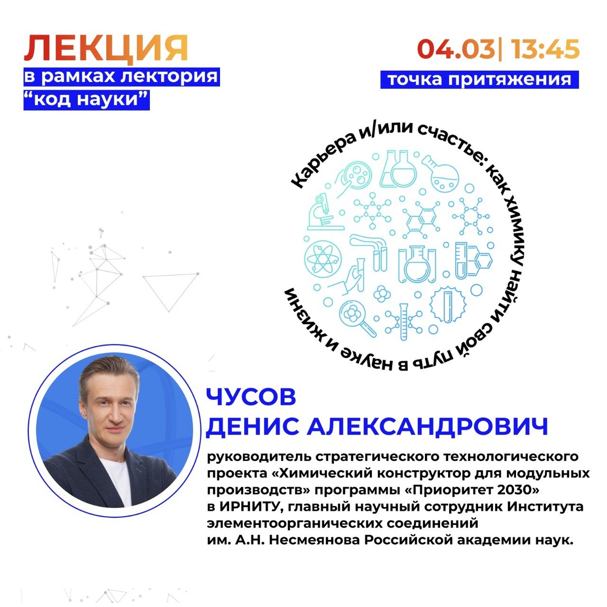 » 🚀 📅📍4 марта в 13:45 в Точке притяжения (дальний зал библиотеки) состоится лекция на тему «Карьера и/или счастье: как химику найти свой путь в науке и жизни». 🧪 Как совместить профессиональный рост в сфере химии с личным благополучием? Где проходит грань между карьерными целями и подлинным ощущением счастья? На лекции эти вопросы станут основой для обсуждения, которое поможет молодым учёным и студентам сориентироваться в современном мире науки и найти собственный путь к успеху и гармонии. Спикер – Чусов Денис Александрович, профессор ИРНИТУ, руководитель стратегического технологического проекта «Химический конструктор для модульных производств» программы «Приоритет 2030» в ИРНИТУ, главный научный сотрудник Института элементоорганических соединений им. А.Н. Несмеянова Российской академии наук. Напоминаем, что цикл лекций посвящен обозначению больших вызовов и крупных научных проблем через примеры собственных исследований. 🚀Регистрация на лекцию по ссылке #наука_ИРНИТУ #scien