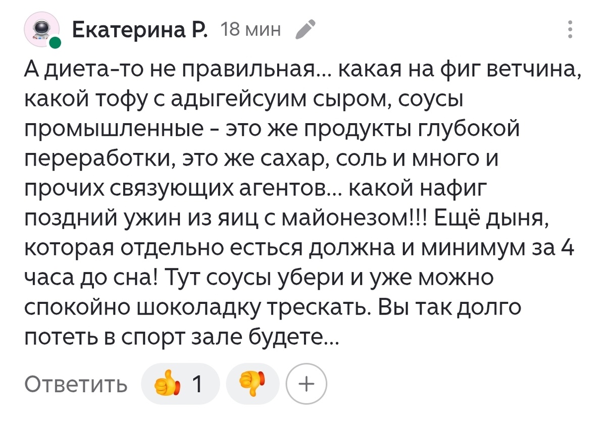 Какие только страшилки и мифы не витают вокруг области похудения. И часто они рождаются так: 1. Дама начиталась какой-то непроверенной инфы в интернете и искренне в нее поверила. Считает, что похудение - это про НЕЛЬЗЯ то, другое и третье. 2. Она начинает настойчиво нести в массы эту инфу, оставляя подобные комментарии в блоге, например, в моем: 3. Ее комментарии выглядят ну очень уверенными (она же реально сильно верит в свои слова). Их подхватывают другие дамы и точно так же начинают яростно нести все в массы, часто еще дополняя страшилками из собственной головы. Например, что толстеют от кефира. Очень интересно, откуда Галина взяла это исследование? Ничего подобного я в интернете не нашла. Яркий пример: что-то где-то прочитала, поверила и понесла в массы. Или что свеклу и рис есть нельзя. Нет ни одного исследования, которое бы доказывало, что от какого-то продукта толстеют! Как бы вас ни уверяли в своей правоте другие люди, они не смогут вам предоставить научные данные о том, что с