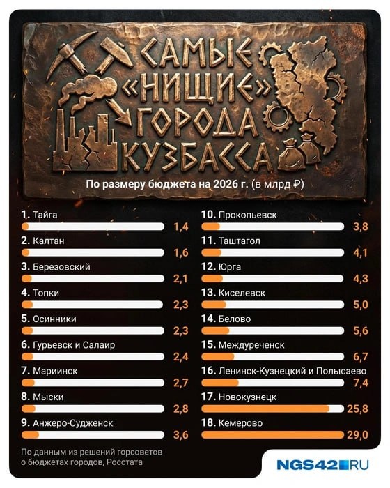 По размеру городского бюджета на 2026 год. Меньше всего он у Тайги — 1,4 миллиарда рублей. Калтан - 1,6 миллиарда. От 2 до 3 миллиардов рублей в казне в Березовском (2,1), Топках (2,3), Осинниках (2,3) Гурьевске и Салаире (2,4), Мариинске (2,7) и Мысках (2,8). В число середняков входят Анжеро-Судженск 3,6 млрд рублей, Прокопьевск 3,8 млрд рублей, Таштагол 4,1 млрд рублей и Юрга 4,3 млрд рублей. Группу от 5 миллиардов и выше образуют Киселевск (5), Белово (5,6), Междуреченск (6,7) плюс Ленинск-Кузнецкий и Полысаево (7,4). В разы больше остальных бюджет у Новокузнецка — 25,8 млрд рублей и Кемерова 29 млрд рублей. Нагляднее показатель бюджета в среднем на жителя Аутсайдер здесь Прокопьевск. На горожанина в среднем выходит 22,5 тысячи рублей. Белово 47,1 тысяч рублей, Новокузнецк 48,9 тысяч рублей, Березовский 49,4 тысяч рублей. Немного выше показатели в Кемерове 53,4 тысяч рублей, Юрге 55,3 тысяч рублей, Анжеро-Судженске 55,5 тысяч рублей, Калтане 56,1 тысяч рублей, Ленинске-Кузнец