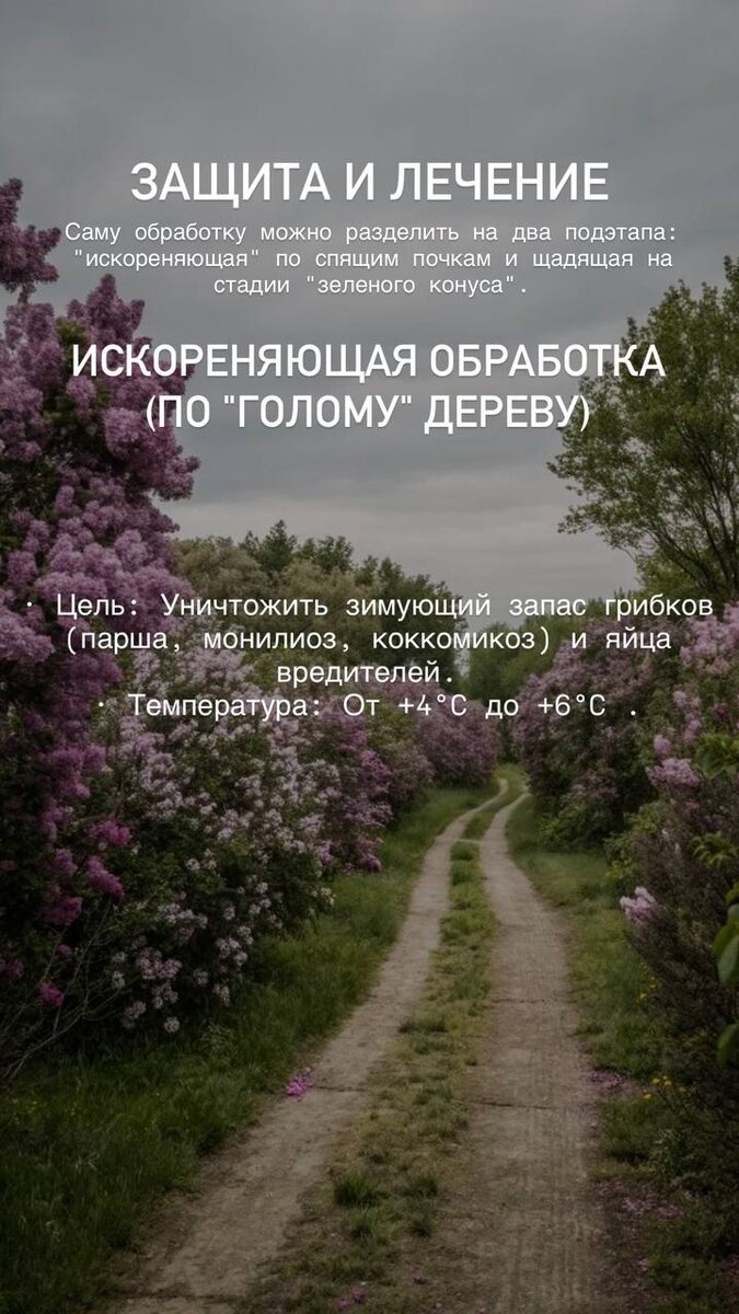 Проводить её нужно строго до распускания почек, когда среднесуточная температура воздуха стабильно держится на уровне около +5°C . Вот пошаговый план работ, разделенный на ключевые этапы. 1. Подготовительные работы (Ревизия и уборка) Прежде чем браться за опрыскиватель, нужно подготовить деревья. · Очистка стволов: Осмотрите кору и с помощью щетки очистите штамбы от отмерших чешуек, лишайников и мха. Именно в трещинах коры зимуют личинки многих вредителей . Весь собранный мусор нужно сжечь, чтобы не разносить заразу по участку . · Санитарная обрезка: До начала сокодвижения вырежьте все подмерзшие, сломанные и больные ветки, а также волчки (жирующие вертикальные побеги) . 2. Защита и лечение (Чем и когда опрыскивать) Саму обработку можно разделить на два подэтапа: "искореняющая" по спящим почкам и щадящая на стадии "зеленого конуса". Искореняющая обработка (по "голому" дереву) · Цель: Уничтожить зимующий запас грибков (парша, монилиоз, коккомикоз) и яйца вредителей. · Температур