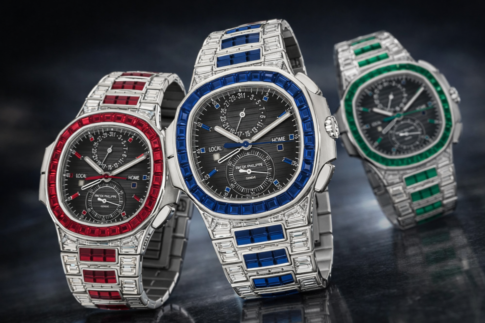 В коллекции часов Patek Philippe линии Haute Joaillerie представлены три версии хронографа в корпусах из белого золота, инкрустированных 406 бриллиантами багетной огранки (33,11 карата) и 192 сапфирами, рубинами или изумрудами. Циферблат угольно-серого цвета с эффектом солнечных лучей, черным градиентным ободком и горизонтальным тиснением подчеркивает спортивную элегантность этих часов, оснащенных автоматическим калибром CH 28-520 C FUS с хронографом с функцией мгновенного сброса показаний Flyback, отображения времени в двух часовых поясах Travel Time, центральным ротором из 21-каратного золота и 55-часовым запасом хода. На циферблате 6 часовых меток из драгоценных камней огранки «принцесса» и 4 часовых метки огранки «багет» усиливают сияние и эффект роскоши. 60-минутный счетчик хронографа расположен на 6 часах, специальные индикаторы дня/ночи для местного (Local) и домашнего (Home) времени – на 3 и 9 часах, указатель даты – на 12 часах. Закругленные стрелки в форме палочек показывают