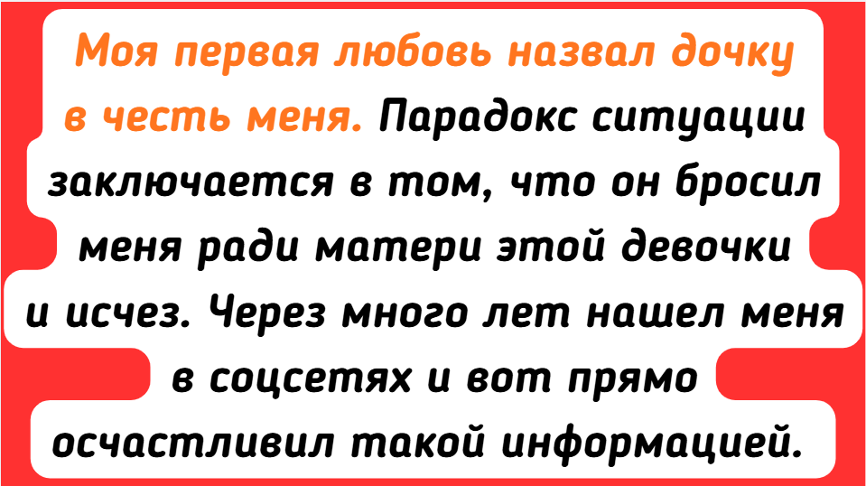 - Моя первая любовь назвал дочку в честь меня. Парадокс ситуации заключается в том, что он бросил меня ради матери этой девочки и исчез. Через много лет нашел меня в соцсетях и вот прямо осчастливил такой информацией. Прислал фото 16-летней дочери и сказал, что она такая же красивая, как я. Это так трогательно!