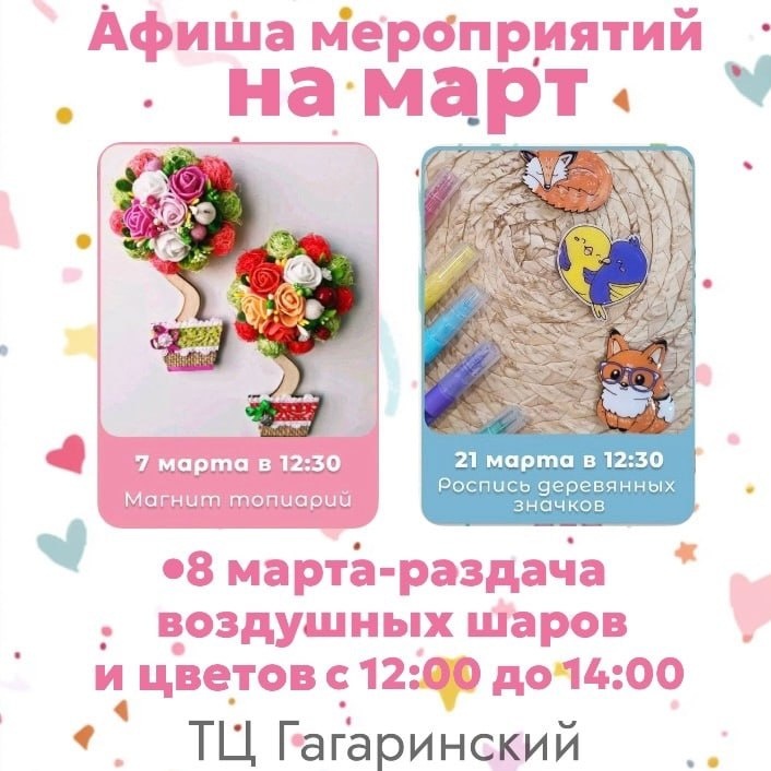 🌸🎈 📍 2 этаж 🎫 вход свободный В марте будет два классных повода заглянуть за настроением: сначала — творчество и уютный мастер-класс, а на следующий день — приятные мелочи к 8 Марта 💐 🗓 7 марта, 12:30 🌿 Мастер-класс: магнит-топиарий Сделаете маленький «букетик» своими руками — симпатичный магнит, который останется на память и будет радовать дома. 🗓 8 марта, 12:00–14:00 🎈💐 Раздача шаров и цветов Просто так — для улыбок, фото и праздничного настроения ❤️ 👉 Подписаться на нас в MAX 📲 .