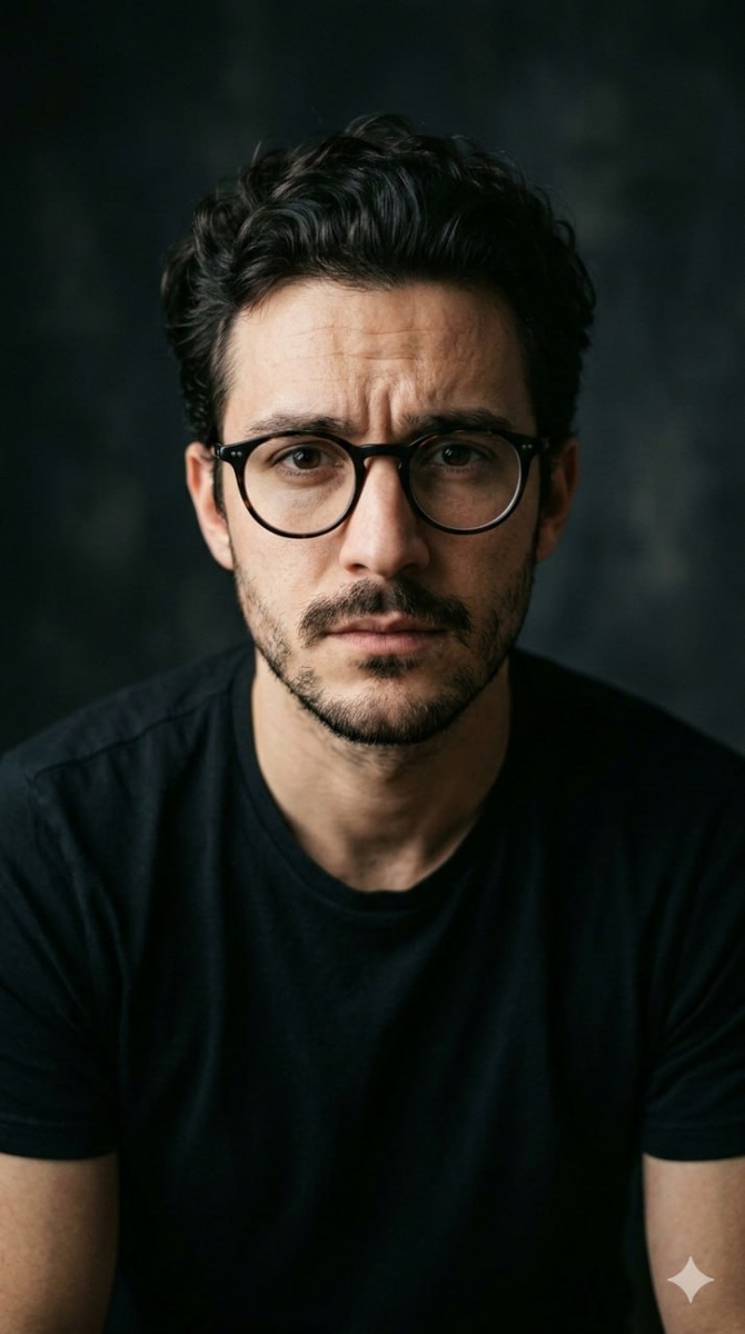 Сегодня, 4 марта - Международный день очкарика. Поздравляем своих очкариков :) Создай фото. ## Основное Портрет молодого мужчины, перенеси черты лица, мимику и внешность точно с загруженных фотографий — это приоритет. --- ## Субъект Мужчина. Круглые очки с тёмной оправой. Чёрная футболка с круглым вырезом. Тёмные, слегка вьющиеся волосы, уложенные назад. Лёгкая щетина и усы. --- ## Выражение лица Задумчивость и лёгкое напряжение. Брови слегка сведены. Тёмные глаза, взгляд направлен прямо в камеру. --- ## Композиция Фронтальная, субъект по центру кадра. Верхняя часть тела занимает большую часть изображения. Лёгкое приближение, подчёркивающее детали лица. --- ## Свет и фон Мягкое боковое освещение с лёгкими тенями — создаёт объём и драматизм. Тёмный, однотонный, размытый фон — выделяет субъекта. --- ## Стиль Студийный реалистичный портрет. Атмосфера интроспекции и сдержанной элегантности. --- **Ключевое требование:** точно воспроизвести черты лица с загруженных фотографий — ф
