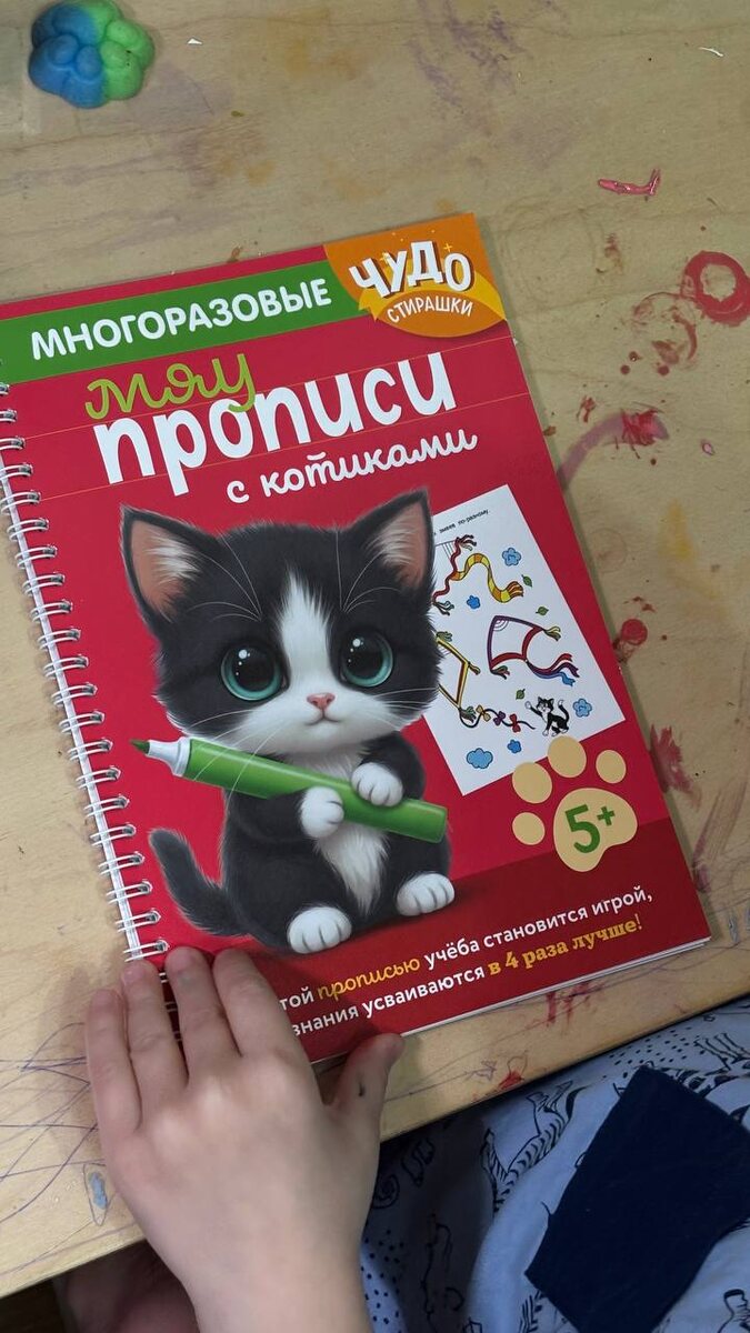 Чудо стирашки: для детей 5-6 лет издательство Эксмо котики и прописи - самое замечательное сочетание для моего 5летки. Руслан активно учится писать и читать, это его желание, мы не навязываем. Поддерживаем его во всем, особенно в рисовании (думаю по столу можно это заметить) Прописи помогают освоить базовые навыки: развить мелкую моторику, логику, мышление и внимание. Тетрадь выполнена в формате книжки на пружине: ламинированные листы защищены от влаги и рассчитаны на активное использование. Написанное легко стирается влажной салфеткой, поэтому задания можно делать много раз. Упражнения очень разнообразные: обводить по пунктиру, штриховать, дорисовывать половинки, проходить лабиринты, решать ребусы, познакомится с написанием печатных букв и цифр, с составом числа, с простейшими математическими действиями: сложением и вычитанием. #школьная_подготовка купила на озон ссылка