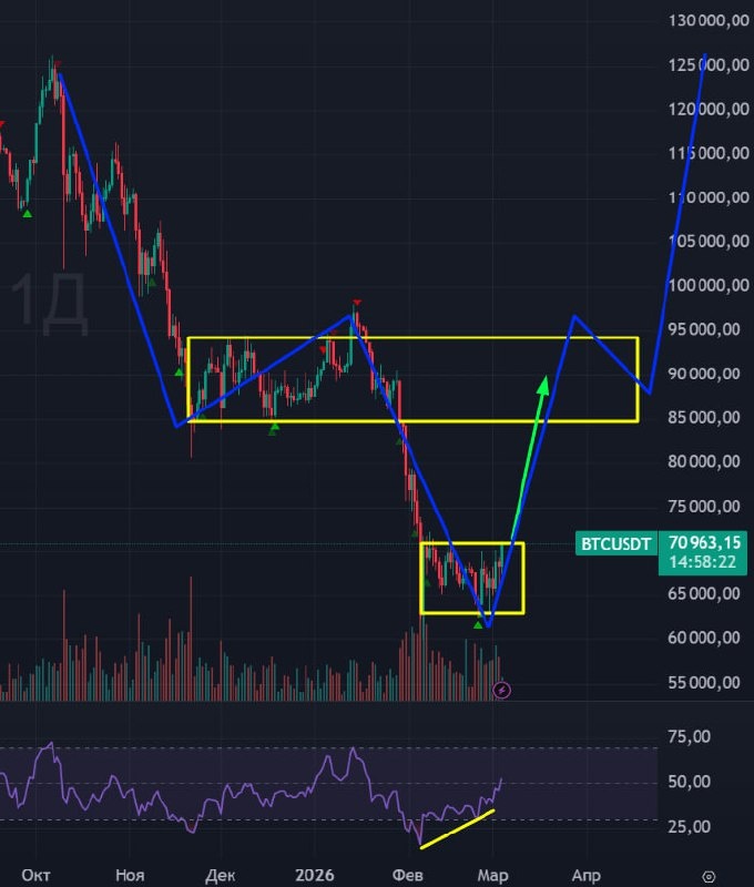 📱 Биткойн 🟢 Тут я жду самое настоящее бычье ралли, как и в металлах. Биток благополучно в тот же вечер отыграл весь негатив от военных действий, после чего продолжает двигаться вверх. 🟢Сейчас цена на верхней границе накопления. В случае его пробития буду ждать биткойн к уровню прошлого боковика. В случае, если и его потом съедим, то стоит ждать синий сценарий - голова и плечи, с перехаем максимумов. Собственно такой вариант в идеале и жду. 🚗 Жду биткойн вверх. Цели: 90000 или 125000+ #биткойн #btcusd #btc #ibit #bogdanoffinvest $BTJ6 $BTH6 $IBH6 $BTK6
