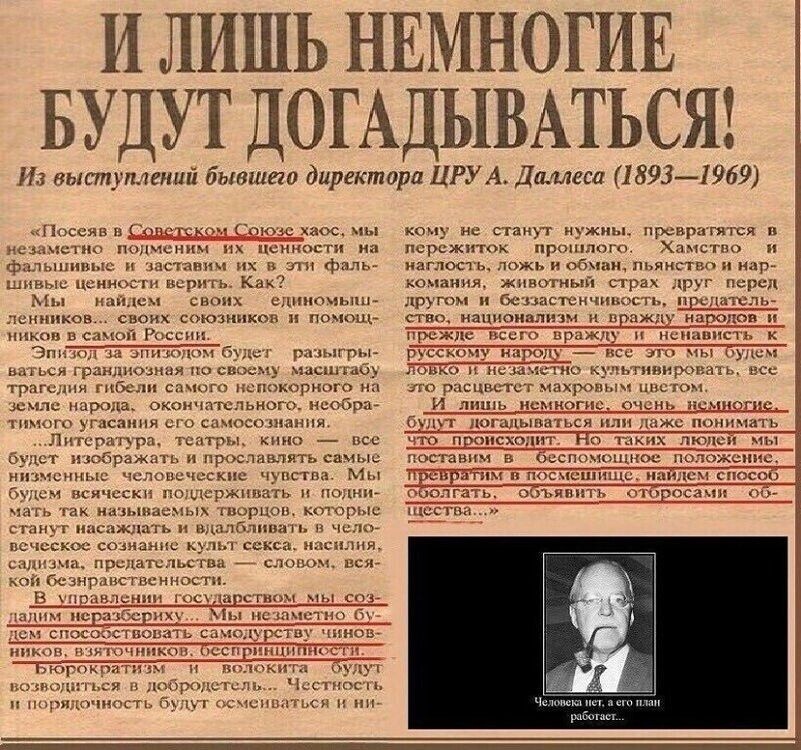 Из литературы и искусства, например, мы постепенно вытравим их социальную сущность, отучим художников, отобьем у них охоту заниматься изображением... исследованием тех процессов, которые происходят в глубинах народных масс. Литература, театры, кино — всё будет изображать и прославлять самые низменные человеческие чувства. Мы будем всячески поддерживать и прославлять так называемых художников, которые станут насаждать и вдалбливать в человеческое сознание культ секса, насилия, садизма, предательства, — словом, всякой безнравственности. В управлении государством мы создадим хаос и неразбериху. Мы будем незаметно, но активно и постоянно способствовать самодурству чиновников, взяточников, беспринципности. Бюрократизм и волокита будут возводиться в добродетель. Честность и порядочность будут осмеиваться и никому не станут нужны, превратятся в пережиток прошлого. Хамство и наглость, ложь и обман, пьянство и наркомания, животный страх друг перед другом и беззастенчивость, предательство. Национализм и вражда народов, прежде всего вражда и ненависть к русскому народу — всё это расцветет махровым цветом. И лишь немногие, очень немногие будут догадываться или даже понимать, что происходит. Но таких людей мы поставим в беспомощное положение, превратим в посмешище, найдем способ их оболгать и объявить отбросами общества. Будем вырывать духовные корни, опошлять и уничтожать основы духовной нравственности. Мы будем браться за людей с детских, юношеских лет, главную ставку будем делать на молодежь, станем разлагать, развращать, растлевать её. Мы сделаем из них циников, пошляков, космополитов.