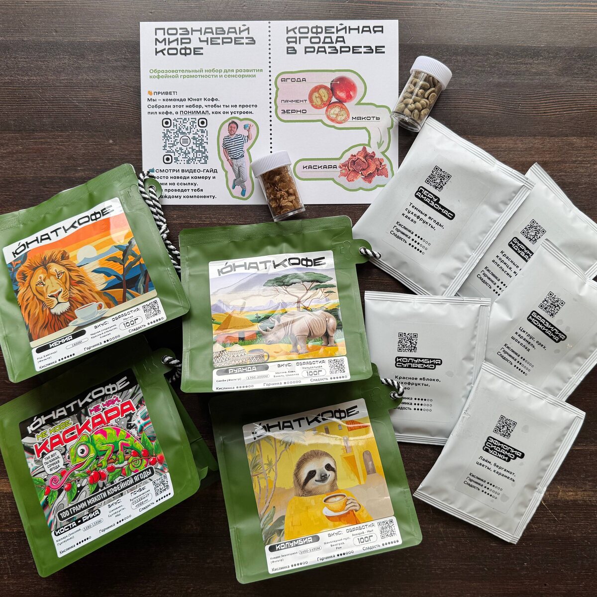 Приехал Юнат Кофе! В этот раз что-то новенькое. Это образовательный набор для развития кофейной грамотности и сенсорики. Вот, что в наборе: • Три пачки зёрен по 100 г в обжарке под фильтр с разными обработками. Цель: почувствовать, как обработка меняет вкус кофе. • Пять дрипов из разных регионов. Тут всё просто: познакомиться с регионами и понять собственные предпочтения, то есть насколько Эфиопию любишь сильнее остальных регионов. • Образцы зёрен зеленого кофе и кофейной шелухи. Цель: изучить, как это выглядит. • Каскара, чтобы заварить и попробовать её вкус. Получается, что набор знакомит с обработками, регионами и строением кофейной ягоды. На мой взгляд, задумка суперская! Такой набор и самому изучить приятно, и как подарок подойдёт. @Кофезавр