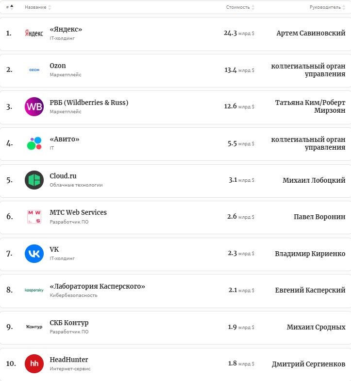 ΠΊΠΎΠΌΠΏΠ°Π½ΠΈΠΉ ΡΠΎΡΡΠΈΠΉΡΠΊΠΎΠ³ΠΎ ΠΈΠ½ΡΠ΅ΡΠ½Π΅ΡΠ°. Π ΡΠΏΠΈΡΠΊΠ΅ β Π»ΠΈΠ΄Π΅ΡΡ ΡΠΈΡΡΠΎΠ²ΠΎΠΉ ΡΠΊΠΎΠ½ΠΎΠΌΠΈΠΊΠΈ: ΠΌΠ°ΡΠΊΠ΅ΡΠΏΠ»Π΅ΠΉΡΡ, IT-ΠΏΠ»Π°ΡΡΠΎΡΠΌΡ, ΠΎΠ½Π»Π°ΠΉΠ½-ΡΠ΅ΡΠ²ΠΈΡΡ, ΡΠΈΠ½ΡΠ΅Ρ