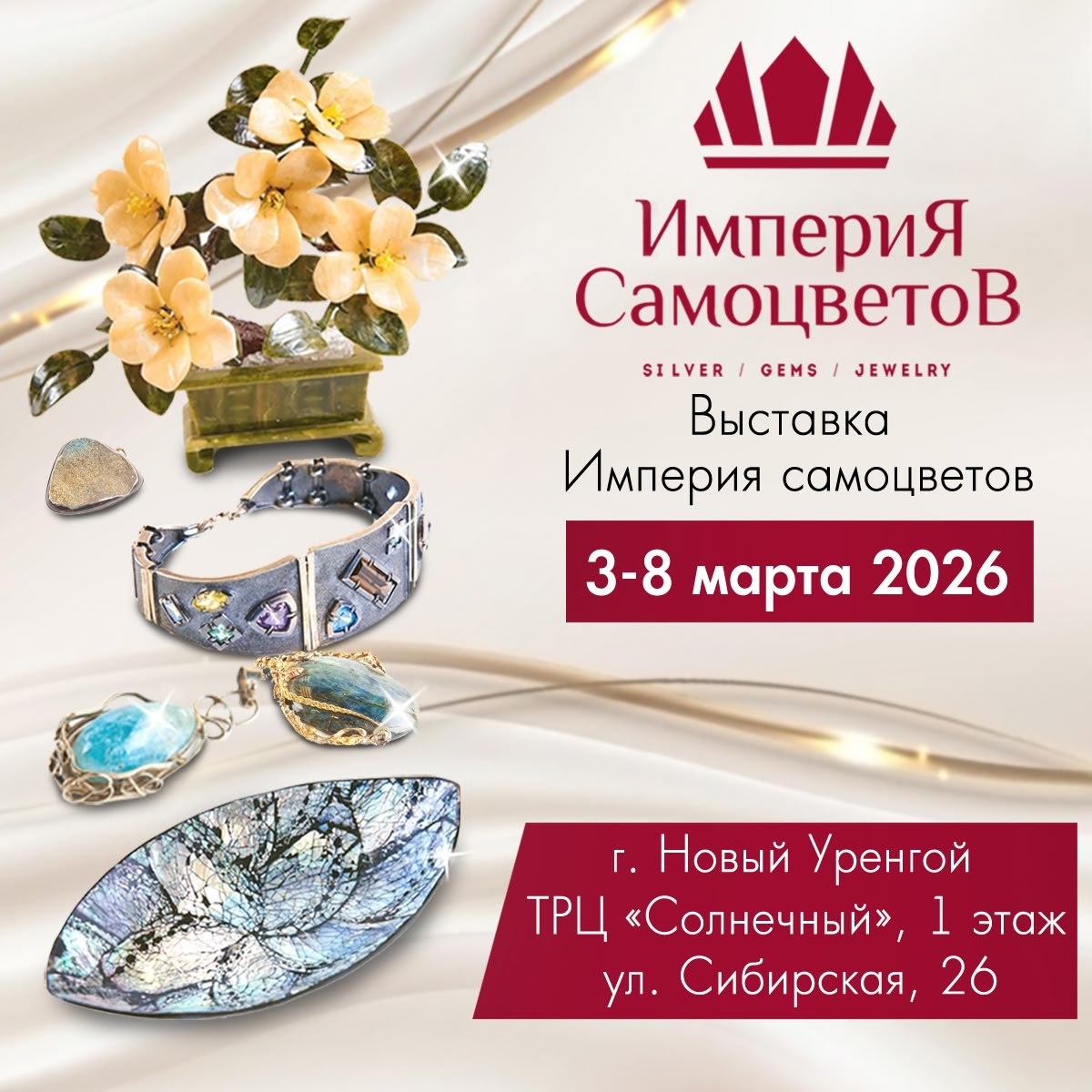 ». Украшения с натуральными камнями - это не просто подарок, это талисман, который оберегает своего владельца. Чароит, бирюза, топаз, агат, малахит, опал, янтарь. Яркие и блестящие камни притягивают взгляды, а их уникальные свойства не оставят равнодушными даже самых капризных покупателей. Украшения представлены на любой вкус и кошелек. Кулоны, бусы, серьги, кольца, браслеты, чокеры с уникальной геометрией. Для ценителей особенных вещей: срезы камней, шкатулки, шары с природными узорами, фигурки и полезные сувениры. 📍 Где: г. НОВЫЙ УРЕНГОЙ, ТРЦ "СОЛНЕЧНЫЙ», 1 этаж Центральный вход. 📅 Когда: с 3 по 8 марта