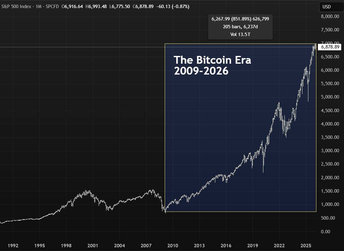 Посмотрите на этот график. S&P 500 с 2009 года — «The Bitcoin Era». Почти весь рост американского рынка пришёлся на период, когда существовал Bitcoin. И теперь ключевая мысль. Все линии, тренды, логарифмические каналы, power-law модели по BTC строились внутри одного большого режима — 17-летнего секулярного бычьего рынка глобальной ликвидности. С 2009 года: — нулевые ставки — QE — экспансия балансов ЦБ — рост долга — приток капитала в риск Bitcoin родился в среде монетарной экспансии. Он не переживал десятилетие жёсткой денежной политики. Он не проходил полноценный secular bear по рисковым активам. Да, были медвежьи циклы 2014–15, 2018, 2022. Но это были циклические коррекции внутри глобального бычьего режима ликвидности. Что это значит? Когда кто-то показывает красивую power-функцию, идеально описывающую цену BTC — это математически корректно… но это аппроксимация внутри одного макрорежима. Мы просто не знаем: — Как поведёт себя BTC при 5–7 годах высоких реальных ставок — Что