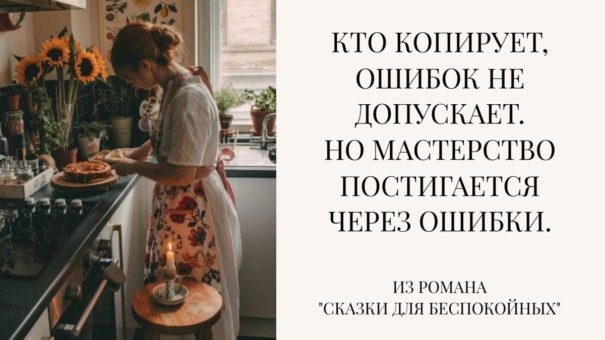 Забыть о возрасте проще, чем ты себе представляешь. Просто перестань отмечать дни рождения. Когда забудешь свой возраст, всё начнёт случаться легко. Шестерёнки жизни смажутся внутренним счастьем, предначертанное пойдёт своим ходом. Заведёшь семью, когда для неё созреешь. Учиться пойдёшь, когда захочешь учиться. Люди же набивают свою жизнь незрелым, ненужным, потому что «подошло время». Если хочешь, чтобы с тобой обращались, как с королевой, у тебя должно быть своё королевство. — Если бы не я, где бы ты взяла деньги? — Они бы пришли. Всегда приходили. Нужно начинать день с вопроса и заканчивать день вопросом. «Тебе здесь нравится?» — нужно спрашивать у себя на рассвете. «Ты гордишься тем, что сделал сегодня?» — спрашивать перед тем, как забыться. Если отвечаешь «да» на оба, вернётся исчезнувший свет меж лопаток. Отец Элвиса Пресли решил купить сыну велосипед, но денег у него хватило лишь на гитару. Флеминг не помыл заражённую грибком пробирку, так пенициллин спас миллионы жизней. Всё с