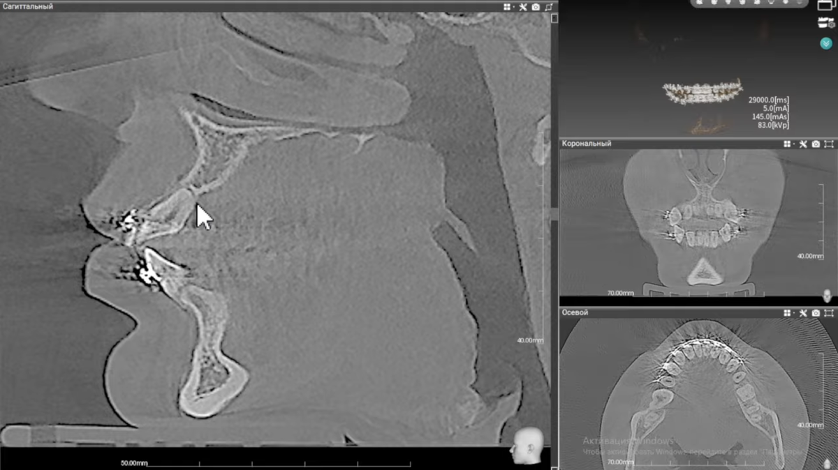 Изначально была выраженная скученность: маленькие челюсти и большое количество зубов. Зубы выпрямляли так, чтобы «уместить» их в зубную дугу. На компьютерной томографии мы увидели следующее: корни четырех верхних резцов укоротились практически в три раза. При этом сами зубы наклонились вперед — сформировалась протрузия. Это состояние уже невозможно вернуть обратно. Корни рассосались окончательно и бесповоротно. Скелетные формы аномалий не всегда корректно решать только брекетами. В ряде случаев требуется хирургическое вмешательство. Важно честно сказать: в моей практике был похожий случай. Пациент с дистальной окклюзией, глубоким прикусом, отсутствием части постоянных зубов (первичная адентия), наличие