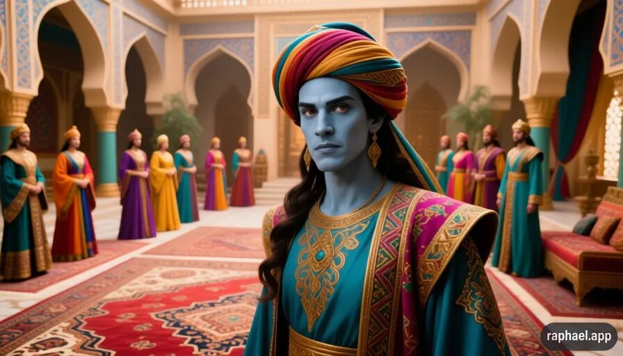 — О вы, чьи шаги слышит даже мрамор, — произнёс он, и голос его был густ, как тягучий сироп, — приблизьтесь, дабы мы говорили не вслушиваясь в эхо от сводов дворца, но лицом к лицу. Позвольте вам предложить скромное угощение, — джинн махнул в воздухе парчовым рукавом, и на низком столике появились фрукты и сладости.