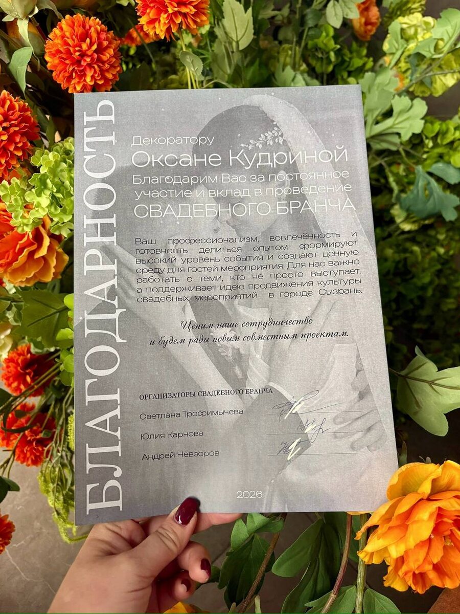 Вижу, как год от года совершенствуется праздник. Это действительно формат настоящего праздника. В этом году в честь юбилейного 5-го «Свадебного бранча» организаторы мне вручили благотворительное письмо. Приятно. Спасибо, что отметили мой вклад.
