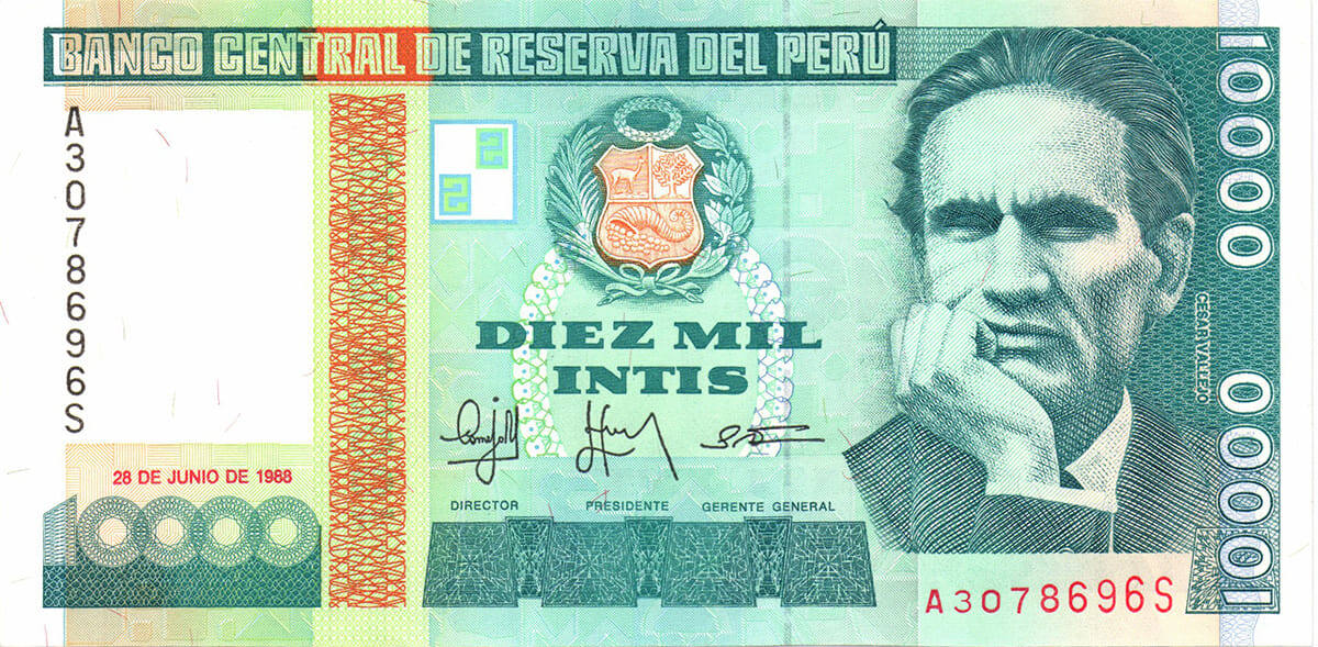 Денежной единицей Перу в 1863 - 1985 гг. был соль. Один соль состоял из 100 сентаво. В 1985 г. из-за высокой инфляции соль сменила другая единица — инти (в честь бога солнца Инти из мифологии инков), 1 инти = 1000 солей. После июля 1991 г. и новой денежной реформы валютой стал новый соль: 1 новый соль = 1000 000 инти. Данная банкнота выпущена в 1988 в разгар гиперинфляции, изъята из обращения в 1992. Размер банкноты 150×75 мм. Основные цвета купюры - темно-зеленый и оранжевый, с различными многоцветными напечатанными элементами. В качестве средств защиты - водяной знак портрет Сесара Вальехо (1892—1938) и флуоресцентные нити случайно разбросанные по банкноте. С левой стороны купюры слева расположена вертикальная полоса без печати, на которой находится водяной знак с портретом. В верхней части которой находится надпись с названием учреждения-эмитента «Banco Central de Reserva del Perú» (Центральный резервный банк Перу). Ниже серийный номер банкноты в вертикальном виде, который повторяет