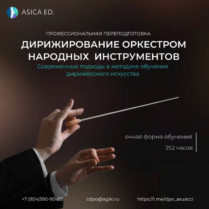 НАРОДНЫХ ИНСТРУМЕНТОВ»! Кому это нужно? ✅ Практикующим руководителям ансамблей и оркестров; ✅ Музыкантам-инструменталистам; ✅ Музыкальным педагогам; ✅ Методистам и менеджерам в сфере культуры с музыкальным образованием. Что вас ждёт? 📌 Интенсивная практика и немного теории; 📌 3 модуля — от основ дирижёрской техники до подготовки концертной программы; 📌 Работа с партитурой, переложение, психология управления коллективом; 📌 Итоговая аттестация — публичное выступление с оркестром! Преподаватели — практики с большим опытом, носители традиций и современного подхода к дирижированию. Старт занятий — с 10 марта 2026 года. Научись превращать нотный текст в живое звучание 👨🎤🎼 📝ПОДРОБНЕЕ: https://cdpo.bitrix24site.ru/dirijer/ 📱К.т.: +7 (924) 590-90-20 ✉️Эл. почта: cdpo@agiki.ru #дирижирование #АГУИККИ #музыкальноеобразование Читайте и смотрите нас на сайте / 💬Telegram / 💙 ВКонтакте / 📺 Rutube / 📲 MAX