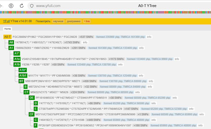 Одна из часто цитируемых систем об гаплогруппах – yFull. Скажу честно, у меня вызывают сомнения даты образования и существования гаплогрупп, которые приводятся в этой системе, но это действительно большой источник информации о группах. Попробовал проанализировать последовательность начальных мужских гаплогрупп, хочу результатами поделится с теми, кого это заинтересует. Начальная группа: A0-T, FGC26606/YP1962 * FGC26591/YP1961 * FGC26620+537 SNPsformed 235900 ybp, TMRCA 161300 ybp. Кроме названия, здесь указано общее количество снипов которые образуют выбранный субклад +537 SNPs. Далее в строке указаны: TMRCA. Переводится как время до ближайшего общего предка. TMRCA 161300 ypb означает, что у всех попадающих в эту группу A0-T жил общий предок 161300 лет назад. А Formed — это TMRCA предыдущего уровня, т.е. материнская ветка A0-T имеет TMRCA равный 235900. Следующая группа: A1, Y9856/Z9282 * Y10090/Z9636 * Y9854/Z9279/C134528+201 SNPsformed 161300 ybp, TMRCA 133400 ybp. Обратите внимание