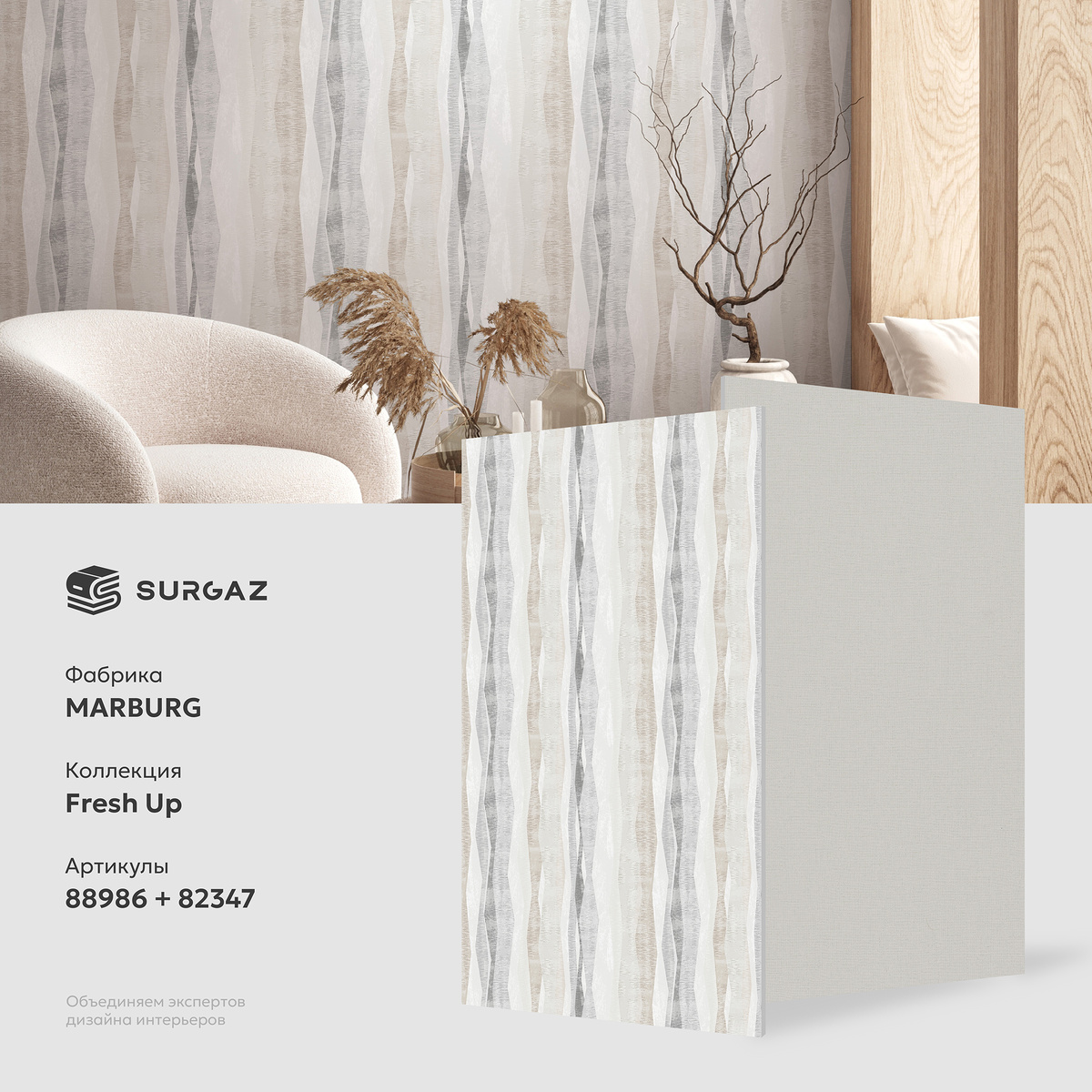 Вертикальный рисунок с мягкими волнообразными формами напоминает струящиеся ленты, кору деревьев или след ветра на песке. Линии плавно перетекают друг в друга, создавая ощущение движения, но при этом сохраняют визуальное спокойствие. Такой узор деликатно вытягивает пространство вверх, делая потолки выше, а интерьер — более лёгким и структурным.