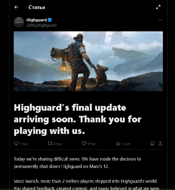 Разработчики поблагодарили игроков и сообщили печальную новость о том, что сервера шутера отключат уже 12 марта. Сегодня они выпустят большой финальный апдейт, а вся дорожная карта, которую они запланировали, навсегда останется не завершенной. F этому добряку. 🎮 Crunch'N'Play 🎮