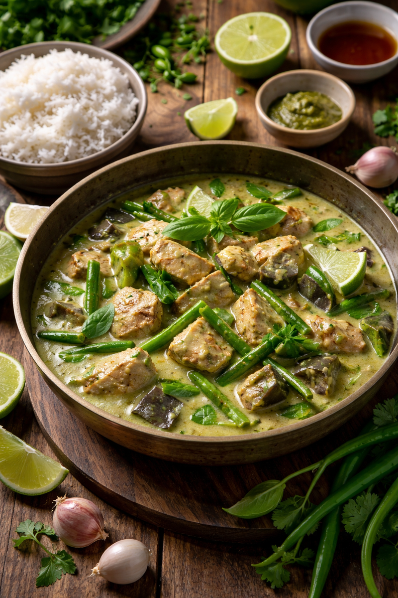 А на деле это блюдо готовится быстрее, чем привычный ужин, и получается ярче любого ресторанного варианта. Если вам близка гастрономия с характером и вы хотите глубже понимать мировую кухню, аккуратно напоминаю о нашем телеграм канале «Вкус мира». Там еще больше историй и тонкостей, которые не всегда помещаются в формат Дзена. Зеленый кари родом из Таиланда, из шумных рынков и кухонь, где пасту растирают вручную в каменной ступке. В отличие от красного кари, зеленый считается более ароматным и травянистым. Его готовят в сезон свежих зеленых чили, когда острота соединяется с нежностью кокосового молока. В традиционных семьях его подают к обеду, когда дом наполняется запахом лайма, лемонграсса и базилика. Это блюдо про баланс, где сладкое, острое и соленое работают как оркестр. Куриное бедро без кости 600 г