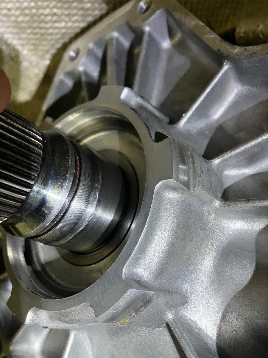 Причина обращения — течь на стыке коробки и раздатки. На диагностике выявили утечку через выходной сальник трансмиссии. Причину нашли в дефекте обработки выходного вала задней планетарной передачи. Заводская шероховатость на поверхности сопряжения не давала сальнику обеспечить герметичность. Вал восстановили абразивами до нужного класса чистоты и установили новый уплотнитель. После теста раздатку сняли повторно, чтобы подтвердить отсутствие течи. Дефект вала 8HP75 На серии 8HP75 шероховатость зеркала вала встречается как заводской брак. Если новый сальник потек через малый пробег, проблему нужно искать в микрорельефе металла. Владельцу важно следить за запотеванием на стыке: абразивный износ вала быстро губит сальник, что ведет к масляному голоданию пакетов фрикционов.