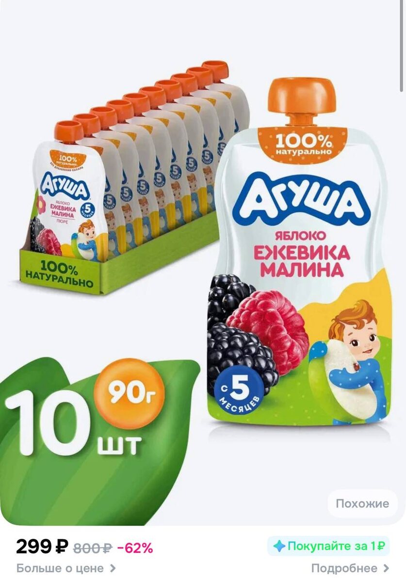 Детское фруктово-ягодное пюре Агуша Яблоко-ежевика-малина пауч в мягкой упаковке, с 5 месяцев, 90г, 10шт