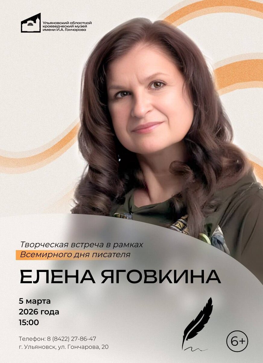 литературы. 🗓️ 5 марта 15:00 📍Историко-мемориальный центр-музей И.А. Гончарова, Ленина 134/20 Автор представит своё творчество, расскажет о темах и мотивах, преобладающих в произведениях, ответит на вопросы аудитории. В рамках мероприятия состоится презентация нового поэтического сборника «Спелой груши нежный аромат». Встреча завершится мастер-классом по созданию стихотворного текста. Мероприятие приурочено к Всемирному Дню писателя. 🏷️ Вход свободный (6+) Подробнее.: 8(8422) 27-86-47, 27-86-45 #5марта26@culturnik