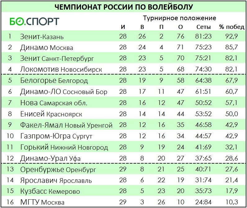 Сегодня матчем в Москве стартовал 29-й тур мужского чемпионата России по волейболу. В регулярном чемпионате 16 команд играют в два круга (30 туров) – по одному матчу с каждым соперником дома и в гостях. Четыре лучшие команды напрямую выйдут в четвертьфинал, а ещё восемь команд (5–12, 6–11, 7–10, 8–9) проведут дополнительный раунд плей-офф из двух матчей с возможным «золотым сетом». Вербов дал «порулить» помощнику, «Локо» ярко отметил болгарский праздник, «Кузбасс» снова проиграл тай-брейк. Итоги 28-го тура суперлиги Чемпионат России. 29-й тур 4 марта, среда МГТУ – Оренбуржье – 3:2 (20:25, 25:21, 20:25, 25:22, 17:15)Шкредов (23), Коротаев (14), Гетман (10) – Юцевич (17), Убипарип (15), Александров (14) 6 марта, пятница 17:00* Факел-Ямал – КузбассТВ: «Волейбол» 18:00* Нова – Белогорье 7 марта, суббота 17:00* Газпром-Югра – ДинамоТВ: «Волейбол» 17:00 Ярославич – Енисей 8 марта, воскресенье 14:00* Динамо-Урал – Горький 17:00 Зенит-Казань – Динамо-ЛОТВ: «Матч! Страна», «Волейбол» Web: Sport