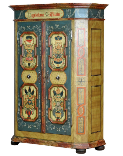 В XVIII и XIX веках в Центральной Европе существовала трогательная и очень практичная традиция: дарить молодоженам расписные шкафы и буфеты. Особенно много таких предметов родом из сельских районов южной Германии. Чаще всего шкафы изготавливали из сосны. Их расписывали вручную яркими красками: выводили полевые цветы, древо жизни, вписывали инициалы счастливой пары готическим шрифтом и дату свадьбы. Каждый шкаф создавался для конкретной пары, с учетом их имен, дат и пожеланий. Это означало одно: двух одинаковых предметов не существовало. Каждый из них — уникальный портрет союза, застывший в дереве и краске. Такой шкаф был не мимолетным жестом, а вкладом в общее будущее. В нем хранили постельное белье, одежду, фарфор, столовые приборы, письма и маленькие сокровища повседневности. Идея заключалась в простом и глубоком замысле: пусть этот предмет сопровождает супругов всю жизнь, становясь молчаливым свидетелем их радостей и испытаний. Во многих европейских регионах подобные расписные шкаф
