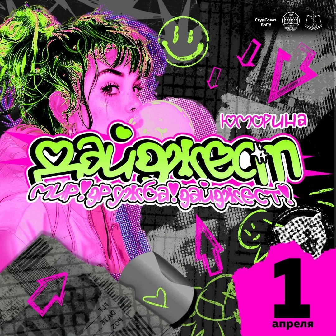 👋 Ежегодный юмористический фестиваль «Дайджест» уже совсем скоро! 🗓 1 апреля ⌚️ 15:00 🏠 Актовый зал ФГБОУ ВО «БрГУ» (ауд А1301) Тема фестиваля — «Мир! Дружба! Дайджест!» 🔥 Подробнее https://vk.cc/cV2ZpJ