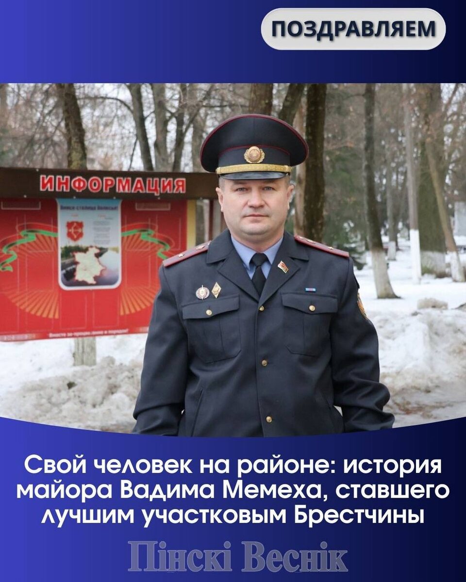 ! ➖В УВД Брестского облисполкома подвели итоги оперативно-служебной деятельности за 2025 год и наградили лучших сотрудников. ✔️Среди них и старший участковый инспектор милиции Пинского ГОВД майор милиции Вадим Мемех. Он стал обладателем престижного переходящего приза имени Александра Яковлевича Шоломицкого. ✔️Начальник управления генерал-майор милиции Олег Шуляковский, вручая награды, подчеркнул: в этом зале собрались те, кто в своей ежедневной, кропотливой деятельности совершает пусть маленькие, но самые настоящие подвиги. ⏩Для майора Мемеха это не первая профессиональная победа, но, как признается сам милиционер, главное признание для него – это не регалии, а безопасность на вверенной территории и доверие людей. @Пинский Вестник 📱Ютуб 📱ВК 📱ИНСТАГРАМ 📱ОК 📱ФЕЙСБУК 📱ТИК ТОК Прислать новость