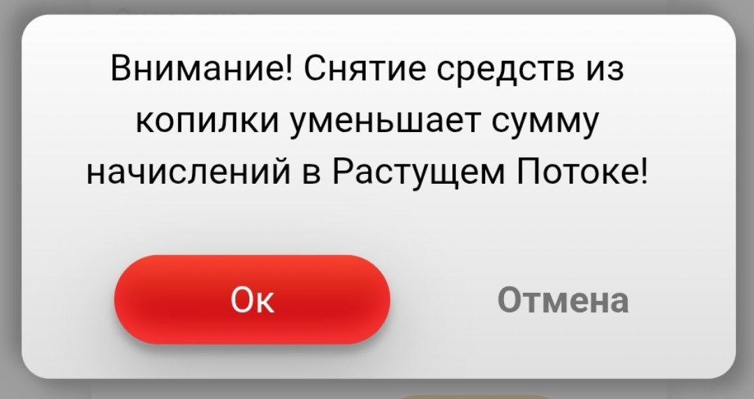 ↗️Теперь в Растущем потоке (Growing Flow) при снятии средств из графы "Кошелька" в "Копилку" появляется дополнительное предупреждающее сообщение. ❗️Система уведомляет вас о том, что перевод уменьшает сумму начислений в Растущем Потоке, и просит подтвердить действие. Если вы передумали или нажали случайно — просто выбирайте "Отмена"❌ Если решение осознанное — нажимайте "Ок"✅ Это сделано для защиты от случайных нажатий и необдуманных действий.