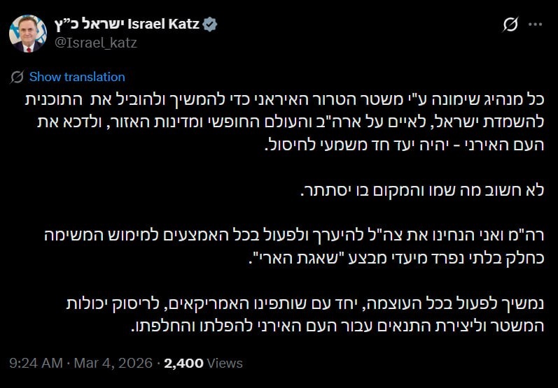 Любой лидер Ирана станет «безоговорочной целью для ликвидации», заявил министр обороны Израиля Исраэль Кац. Любой лидер, который будет назначен иранским террористическим режимом для того, чтобы продолжать руководить планом по уничтожению Израиля, угрожать США, свободному миру и странам региона, а также подавлять иранский народ — станет однозначной целью для ликвидации. Неважно, как его имя и где он будет скрываться. Премьер-министр и я поручили ЦАХАЛу подготовиться и действовать всеми средствами для выполнения этой задачи как неотъемлемой части целей операции «Львиный рык». Мы продолжим действовать со всей силой, вместе с нашими американскими партнерами, для сокрушения возможностей режима и создания условий иранскому народу для его свержения и замены. 🟪Читай в Max | 🚀Читай в Telegram | 🥰Смотри на RUTUBE