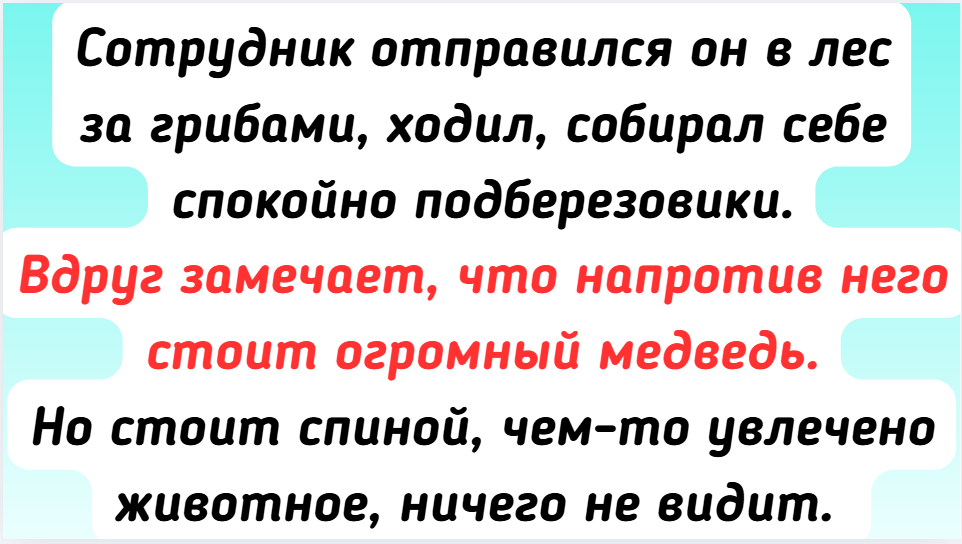 - Осенью сотрудник поделился историей о том, как он почувствовал настоящий страх. Отправился он в лес за грибами, ходил, собирал себе спокойно подберезовики. Вдруг замечает, что напротив него стоит огромный медведь. Но стоит спиной, чем-то увлечено животное, ничего не видит. Буквально 10 секунд знакомый так стоял, не мог пошевелиться и хорошо еще, что от ужаса не заорал. Тихо развернулся, пошел медленным шагом, а потом и вовсе убежал.