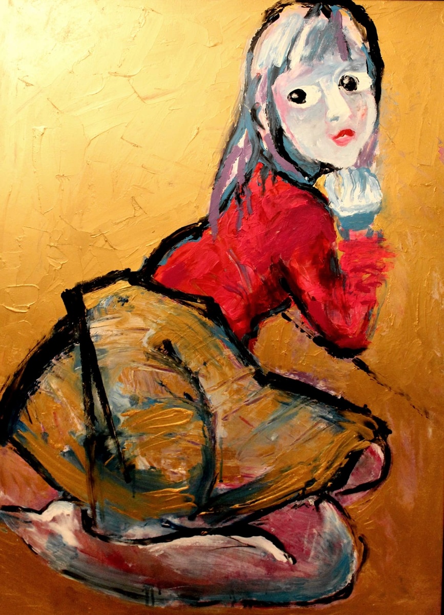 Героиня находится в состоянии внутренней концентрации. Её поза закрыта — ноги поджаты, корпус слегка напряжён. Однако взгляд обращён прямо к зрителю. Возникает двойственность: она одновременно погружена в себя и открыта.