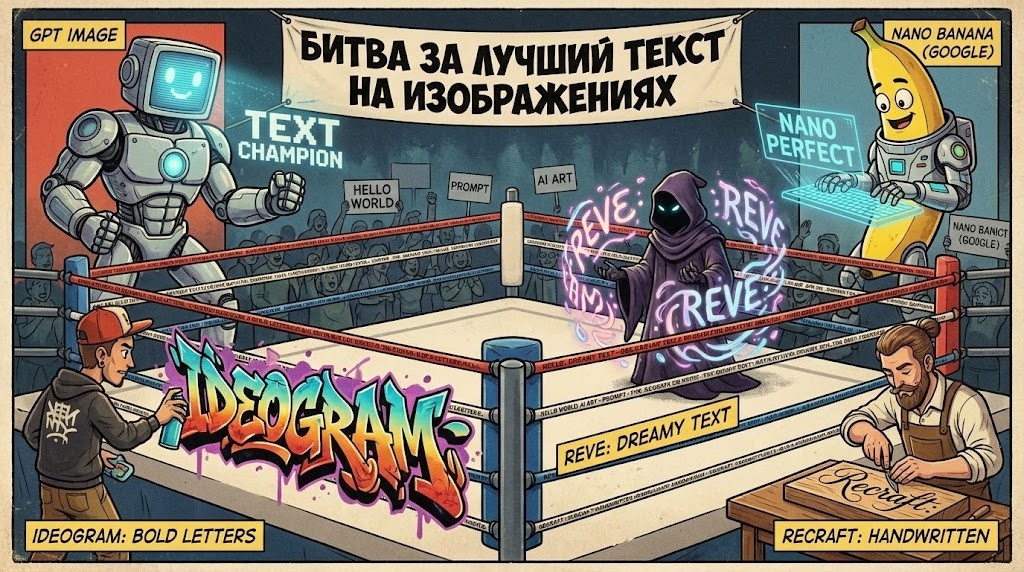 Сегодня устраиваем честную битву пяти главных претендентов на звание "Лучший генератор текста на изображениях на русском языке". В углах ринга: GPT Image, Nano Banana от Google, Ideogram, Recraft и Reve. Каждый обещает идеальный текст, но кто действительно держит слово?