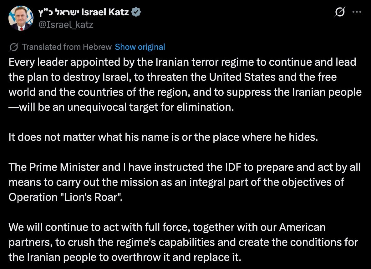 Katz: EVERY FUTURE IRANIAN LEADER IS A TARGET