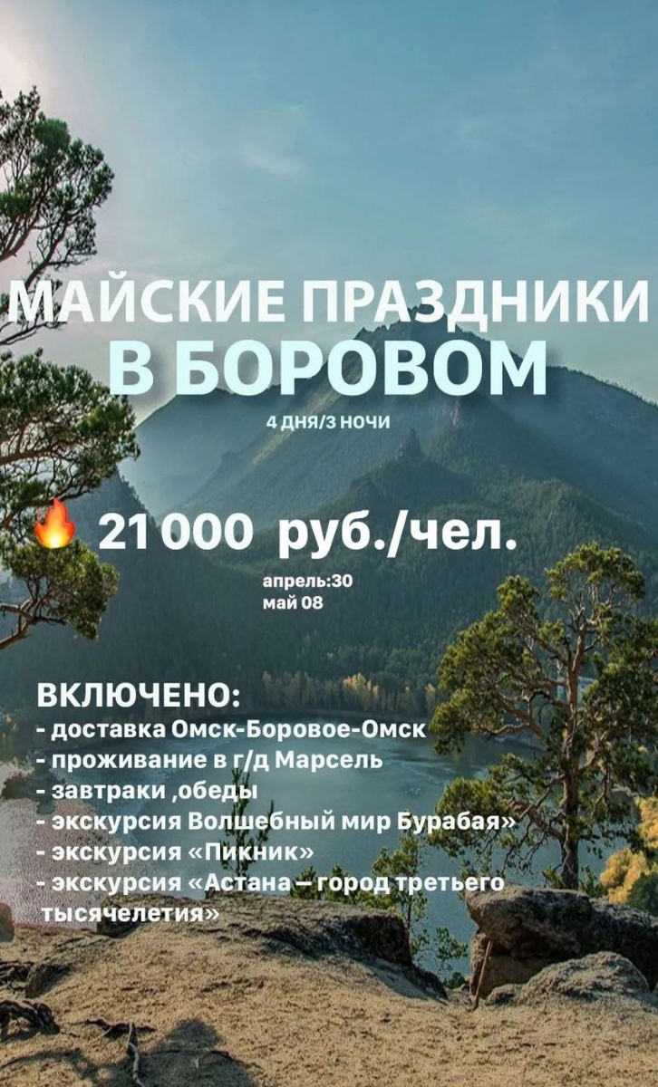 Устали от серых будней? Давайте встретим май на природе! Представляем вам готовый тур в жемчужину Казахстана — Боровое. Даты тура: ➡30.04.-03.05.2026 ➡08.05.-11.05.2026 🔥Цена: 21 000 руб./чел. Включено: ✅трансфер Омск-Боровое-Омск ✅проживание в г/д Марсель, номера стандарт ✅завтраки, обеды ✅3 экскурсии ✅Волшебный мир Бурабая» ✅Пикник ✅«Астана – город третьего тысячелетия»