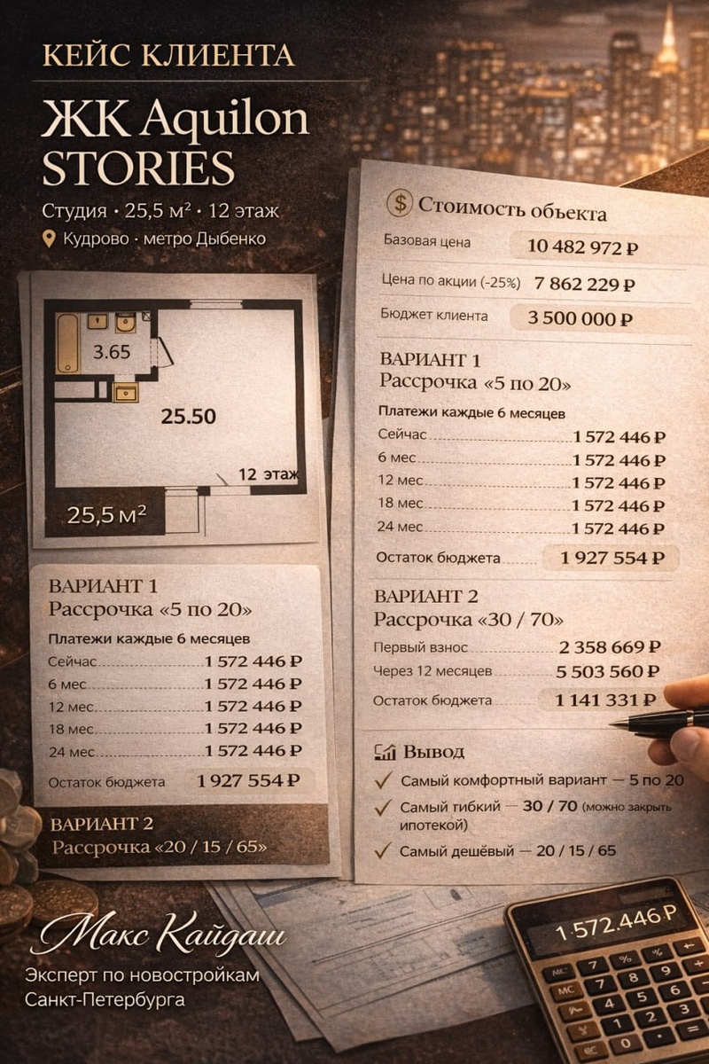 Студия 25,5 м² в ЖК Aquilon STORIES. Застройщик дал акцию -25% от базовой цены, поэтому стоимость квартиры снизилась до 7,86 млн ₽. Бюджет клиента — 3,5 млн ₽. Мы разобрали три варианта рассрочки: 1️⃣ 5 по 20 Пять платежей по ~1,57 млн каждые полгода. 2️⃣ 30 / 70 30% сейчас и остаток через год. 3️⃣ 20 / 15 / 65 Маленький платёж через год, основной — через два года. 📊 Самый комфортный по нагрузке — 5 по 20. Такие расчёты я делаю для клиентов перед покупкой, чтобы выбрать самую безопасную стратегию покупки. Если вы рассматриваете новостройки в СПб — помогу подобрать объект и просчитать варианты покупки под ваш бюджет. Нужна помощь в поиске и подборе новостройки?Ищите квартиру на вторичном рынке?Хотите продать свою?Я готов помочь вот мои контакты: Звоните по номеру +7(911)758-80-32 kaidashmaxim.ru/ novostroikaspb.online/ ПОКУПКА НОВОСТРОЙКИ БЕЗ КОМИССИИ АГЕНТУ!