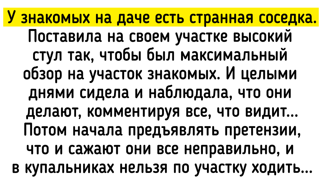 У знакомых на даче есть странная соседка. Поставила на своем участке высокий стул так, чтобы был максимальный обзор на участок знакомых. И целыми днями сидела и наблюдала, что они делают, комментируя все, что видит. Потом начала предъявлять претензии, что и сажают они все неправильно, и в купальниках нельзя по участку ходить, ей смотреть неприятно. Знакомые в ответ на это сделали глухой высокий забор со стороны этой соседки. © Мама Дорогая / ADME