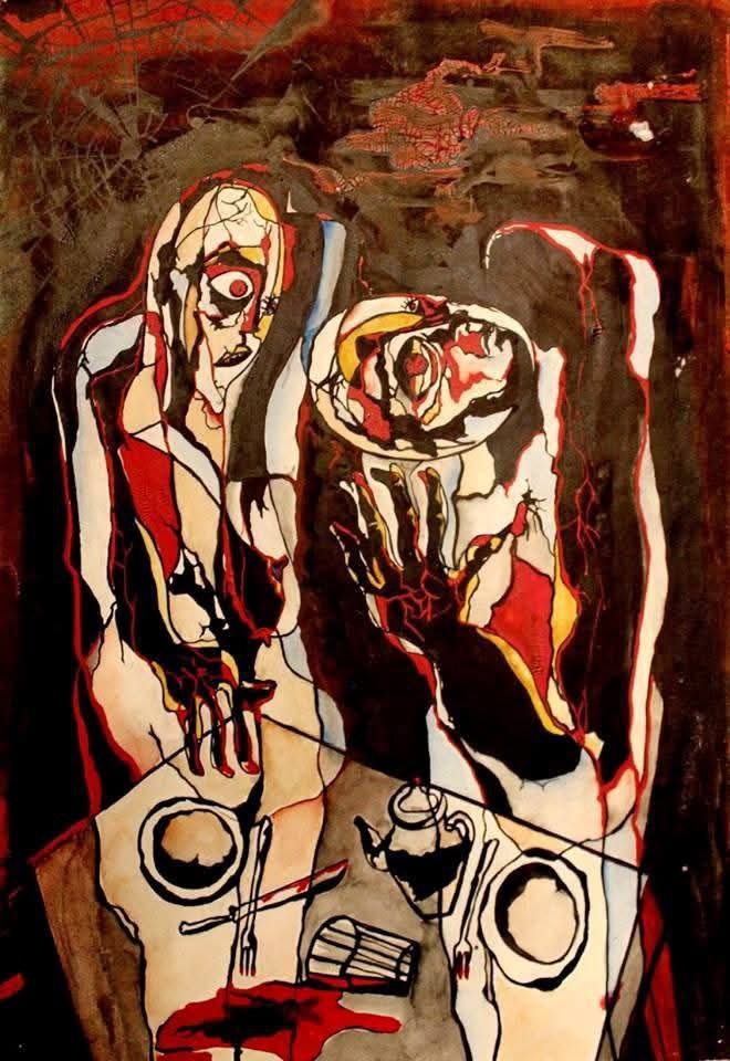 На изображении — две фигуры за столом. Это сцена трапезы. И одновременно — сцена её разрушения.