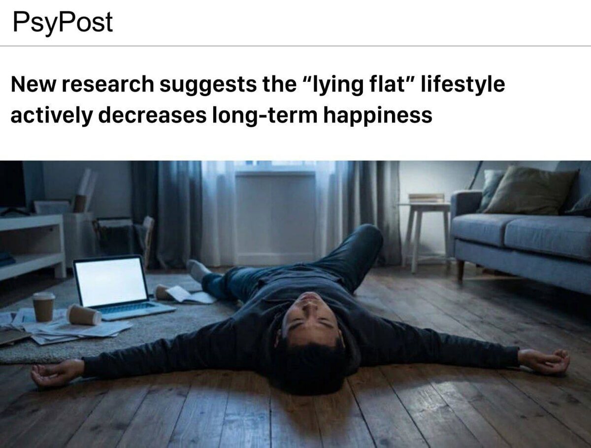 Китайское исследование показало, что молодые приверженцы философии tang ping («лежать плашмя») сообщают о более низкой удовлетворённости жизнью. Главный вывод: именно эта пассивная позиция ведёт к падению удовлетворённости, а не наоборот. Молодые люди отказываются от карьерных амбиций, покупки недвижимости, брака — всего, что требует серьёзных усилий. Вместо этого они стремятся удовлетворять только минимальные потребности и по большому счёту постоянно ничего не делать. Движение возникло в ответ на культуру «996» (работа с 9 утра до 9 вечера, шесть дней в неделю), высокие цены на жильё и отсутствие социального лифта. Люди выгорают, разочаровываются и не видят смысла в продуктивности. «Tang ping служит временным механизмом облегчения после сильного давления, но ценой долгосрочного психологического функционирования», — заключили авторы исследования. С одной стороны, tang ping может показаться выходом в ситуации повышенного уровня ежедневного стресса: если система давит, я могу от неё